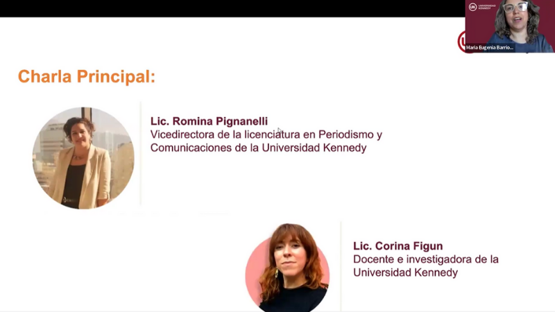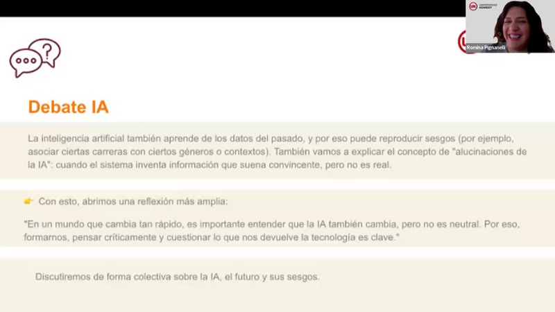 Durante la primera parte de la Jornada la Lic. Romina Pignanelli, vicedirectora de la Carrera de Periodismo, y la Lic. Corina Figún, docente e investigadora de nuestra casa, propusieron una actividad para pensar cómo nos proyectamos a futuro. A través de un ejercicio con inteligencia artificial generativa, invitaron a los y las estudiantes a imaginar distintos escenarios profesionales y reflexionar sobre el uso de nuevas herramientas para el estudio y el trabajo.