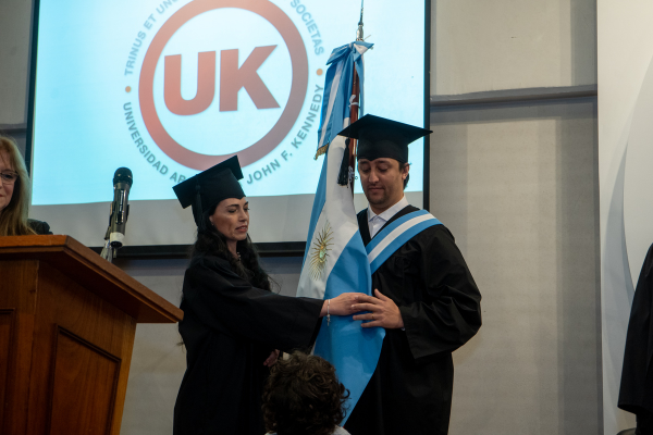 El Abanderado de la ceremonia fue Felipe Silvestre, graduado de la provincia de Buenos Aires, escoltado por Daniela Alejandra Águila, graduada de la provincia de Santiago del Estero, quien además tuvo a su cargo las palabras en representación de los egresados. En un discurso profundamente emotivo, Daniela expresó “Hoy recibimos formalmente nuestro título de Abogada y Abogado, pero recibimos algo más grande. Recibimos una misión, recibimos una responsabilidad, recibimos el privilegio de abogar por quienes no tienen voz. Porque ser abogado no es solo litigar, ser abogado es transformar la injusticia en dignidad. Ser abogado es convertir el silencio en palabra. Ser abogado es devolverle a la sociedad la confianza en la justicia y, con ella, la fe en la vida misma”.