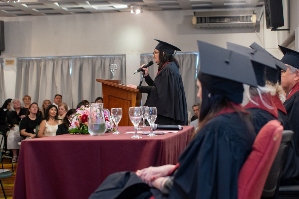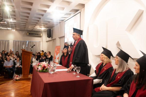 La Decana, Dra. Paula Sardegna, reafirmó el compromiso de la Facultad con la excelencia académica, los valores democráticos y la ética profesional. Instó a los graduados a honrar y defender el derecho desde el lugar que les toque, recordando el mandamiento de Eduardo Couture: “Defiendan el derecho con determinación”; y subrayó que, si el derecho entra en conflicto con la justicia, deben luchar por ella, destacando que ese es el mayor compromiso ético que en este acto asumen. Asimismo, destacó que el título que reciben acredita su formación académica y los convoca a ejercer su profesión con justicia, compromiso y vocación de servicio, asumiendo con responsabilidad social su rol en la comunidad y aplicando sus conocimientos con integridad, ética y dedicación al bien común, valores que distinguen a nuestra Facultad.